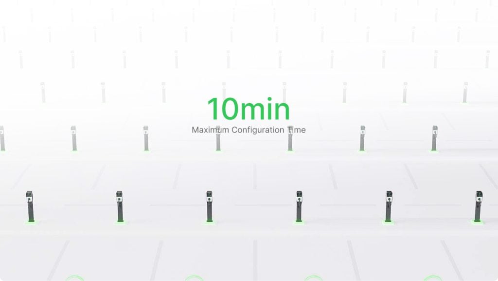Intelligent site positioning and construction, with a one-click guided process for the charger configuration and full-site replication.